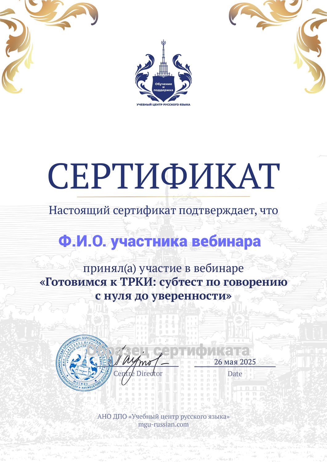 Образец сертификата участника вебинара
