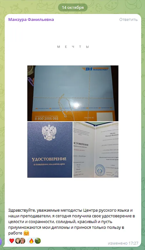 Здравствуйте, уважаемые методисты Центра русского языка и наши преподаватели, я сегодня получила свое удостоверение в целости и сохранности, солидный, красивый и пусть приумножаются мои дипломы и принося только пользу в работе